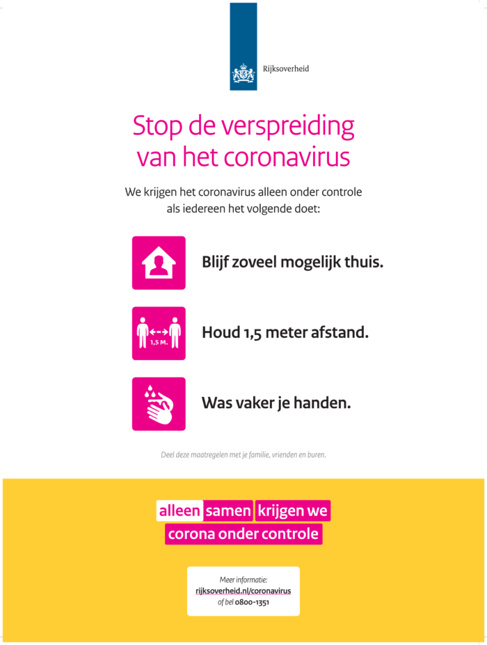 Alle inzet vanuit de overheid is erop gericht het coronavirus verder onder controle te krijgen. Alle maatregelen, zoals eerder gesteld, blijven dus van kracht. We zijn er helaas nog niet. Wij doen dan ook de dringende oproep aan u om u aan de regels te houden en ook in de meivakantie thuis te blijven!